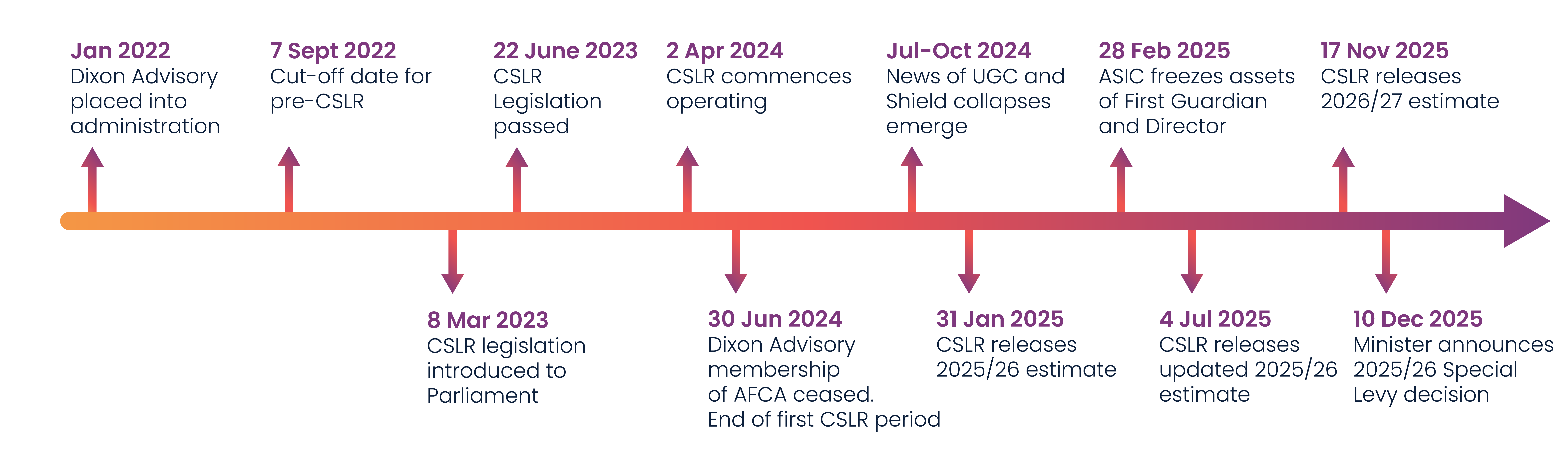 Recommendations to establish a Compensation Scheme of Last Resort (CSLR) go back as far as the Ramsay Review (in 2017), and the proposal was supported by the Hayne Banking Royal Commission in 2019. Legislation was introduced by the former Coalition government in October 2021 but not passed. After the change of government in 2022, legislation enabling the scheme was eventually passed in June 2023 after multiple delays.